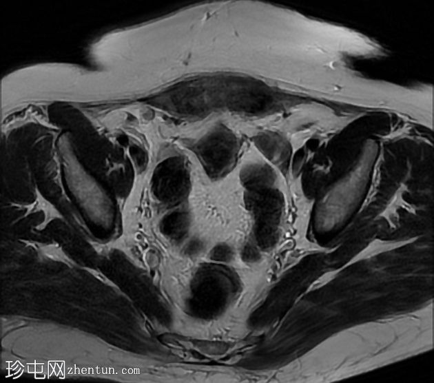该病例显示腹壁前子宫内膜异位症延伸至子宫深处,显示相关的前子宫腺肌瘤。